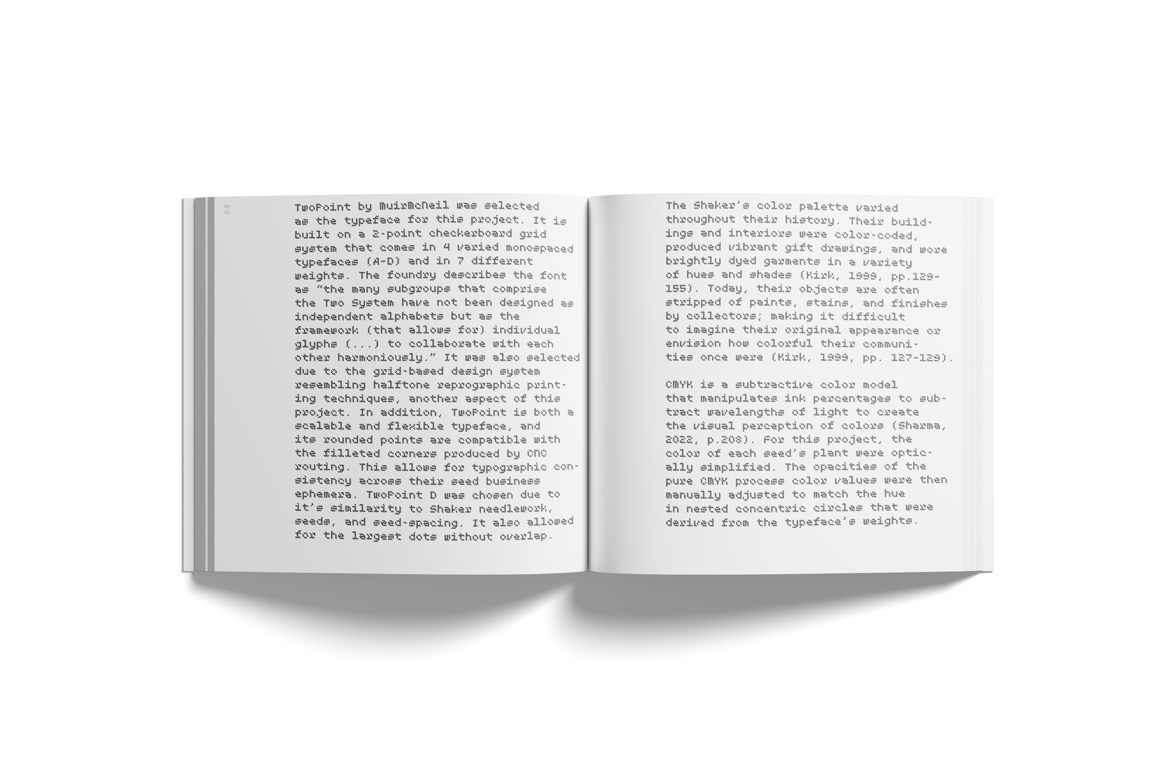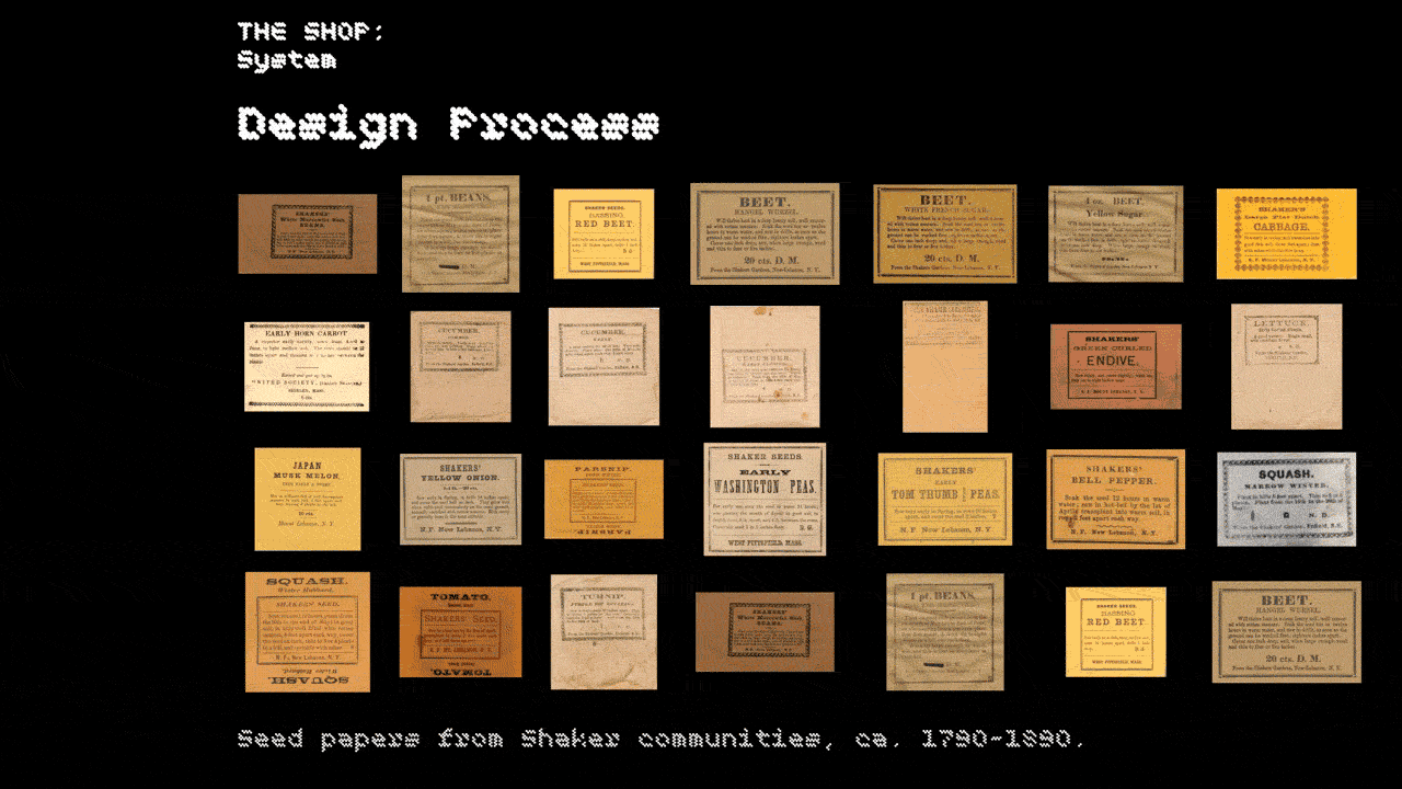 The results produced a cohesive set of imagined artifacts, including a redesigned series of seed papers, a modular visual system, and a project book that documents the processes, framework, and conclusions. These outcomes envision how the Shaker Seed Company's identity might have evolved if the community, its design philosophy, and the innovative spirit cultivated under Joseph Meachem's guidance had continued to evolve into the present. This project demonstrates how design research can be leveraged to envision alternative realities, drawing on historical practices to explore contemporary design possibilities.