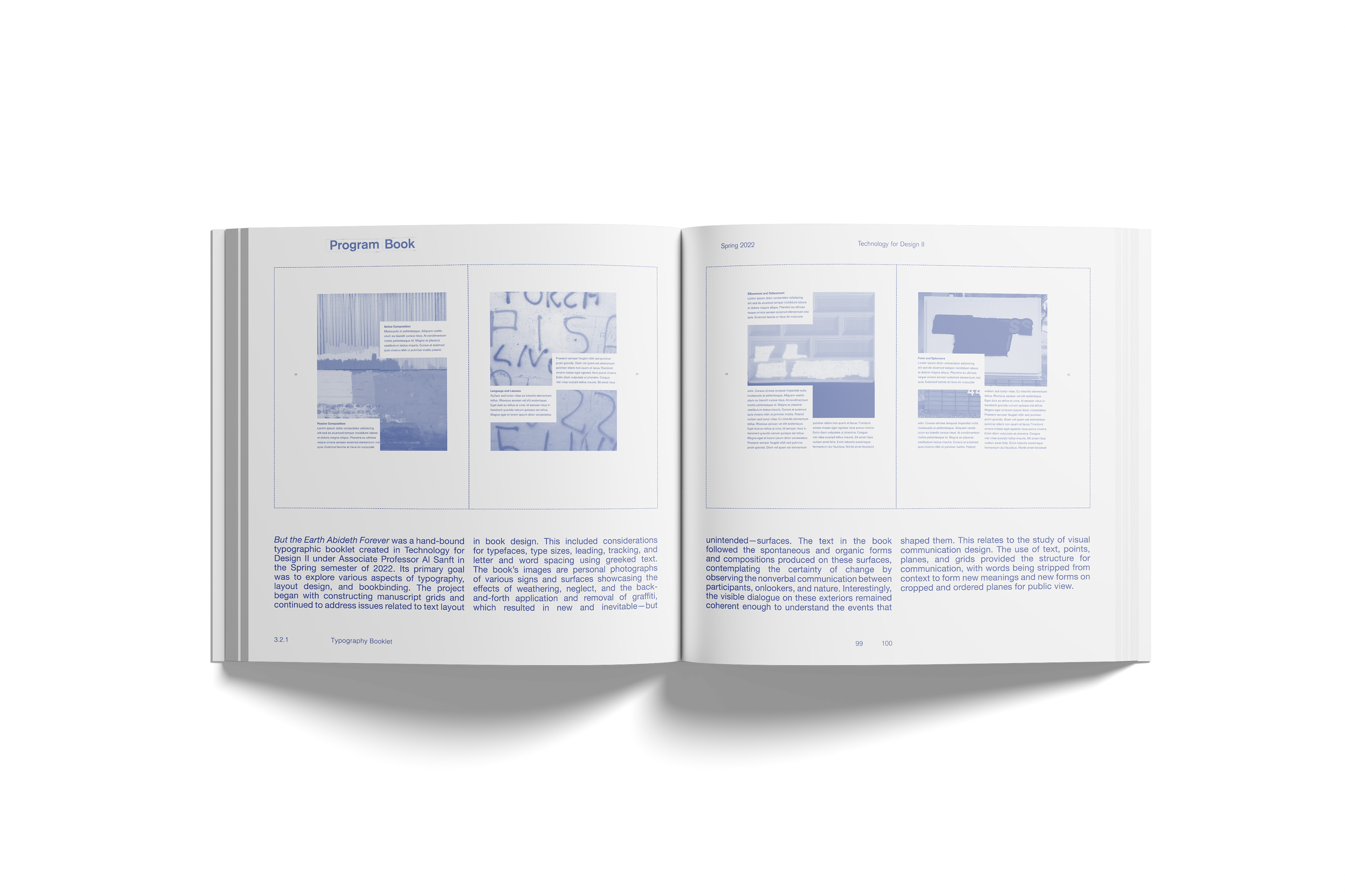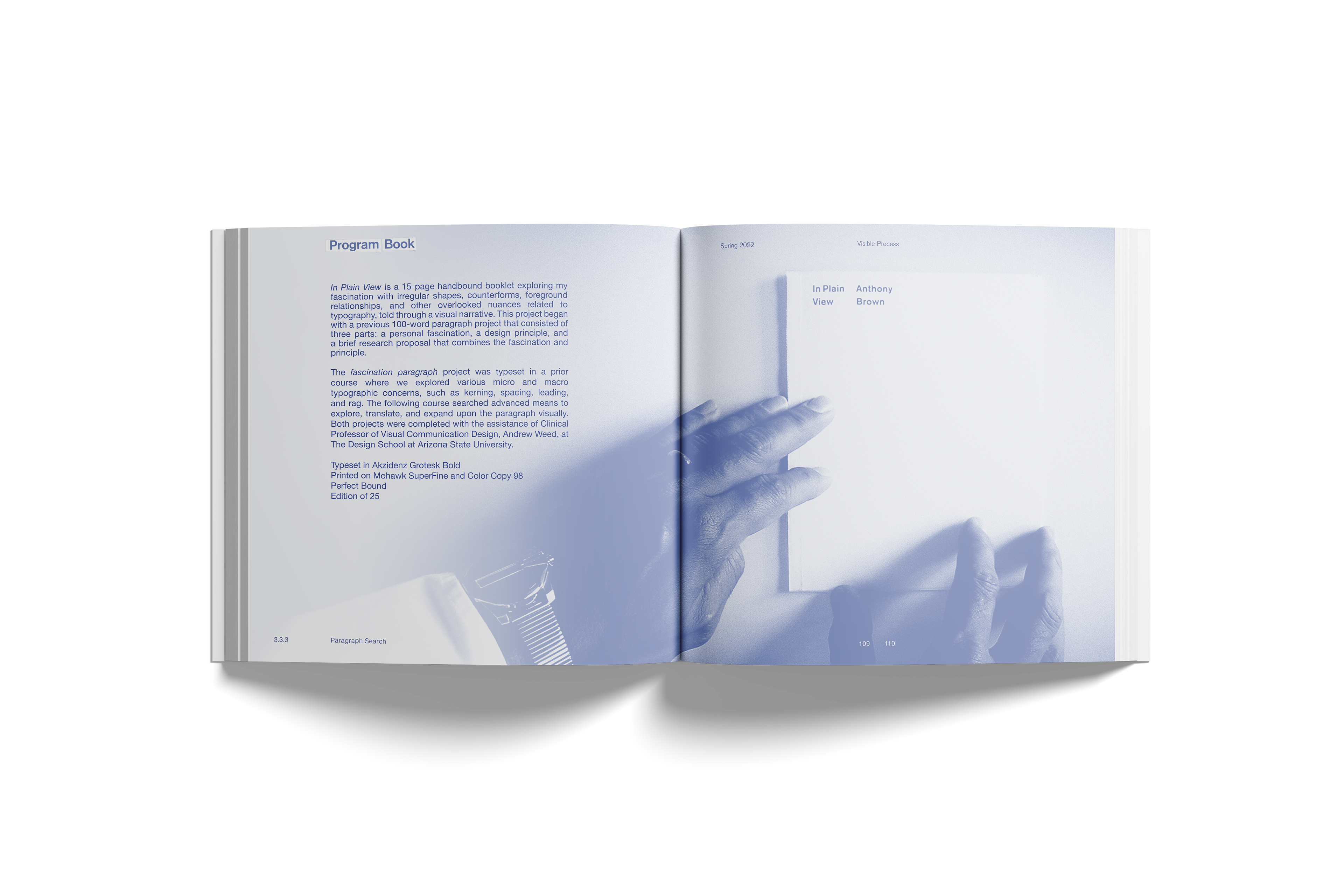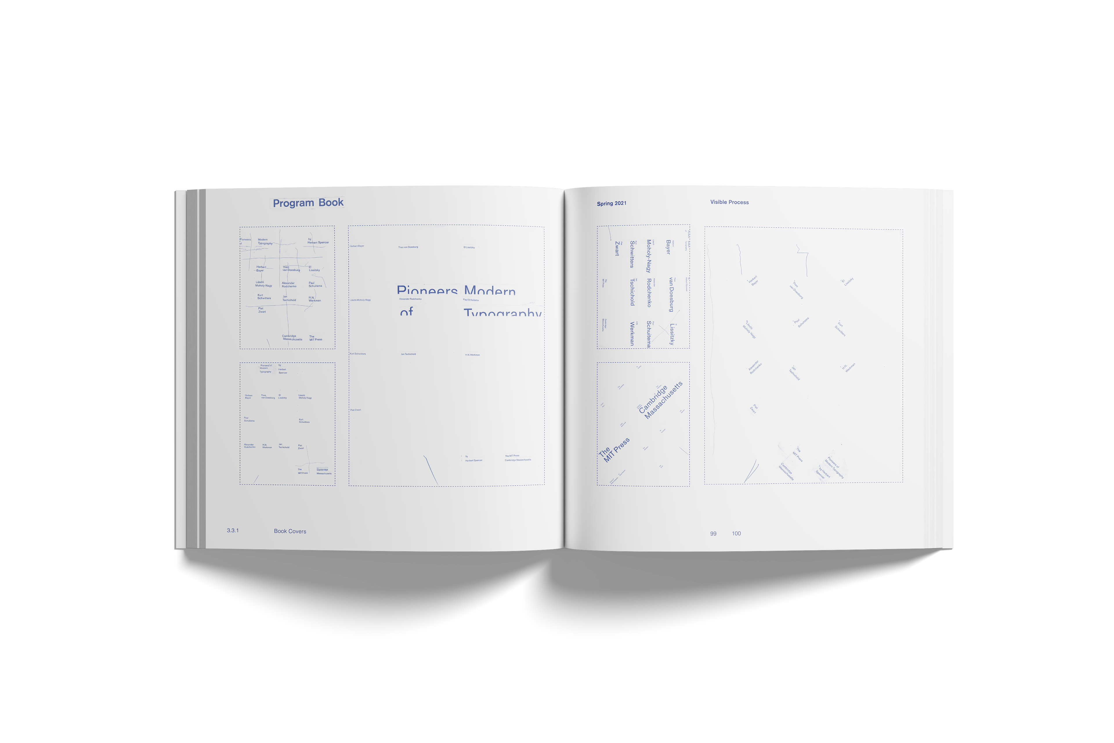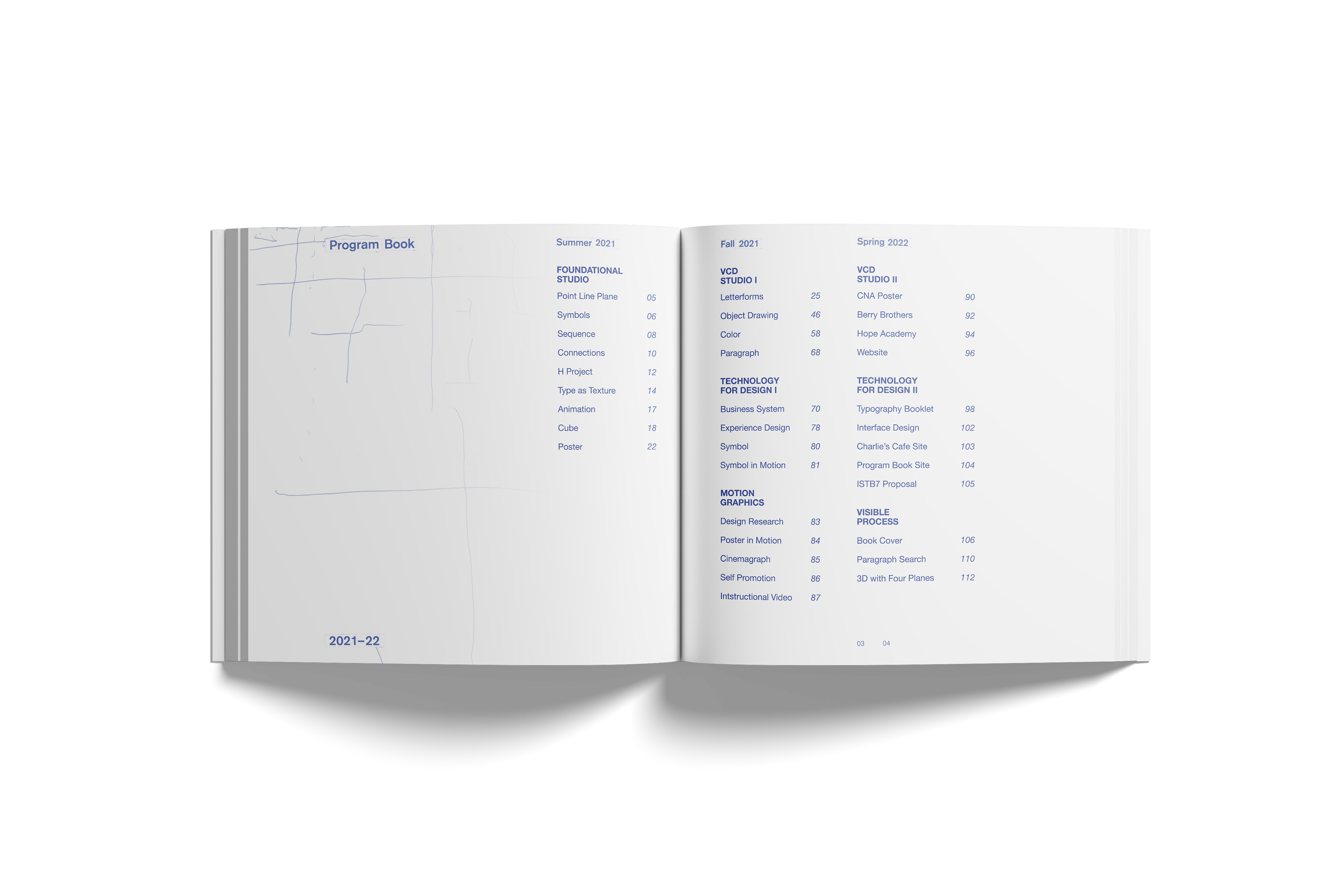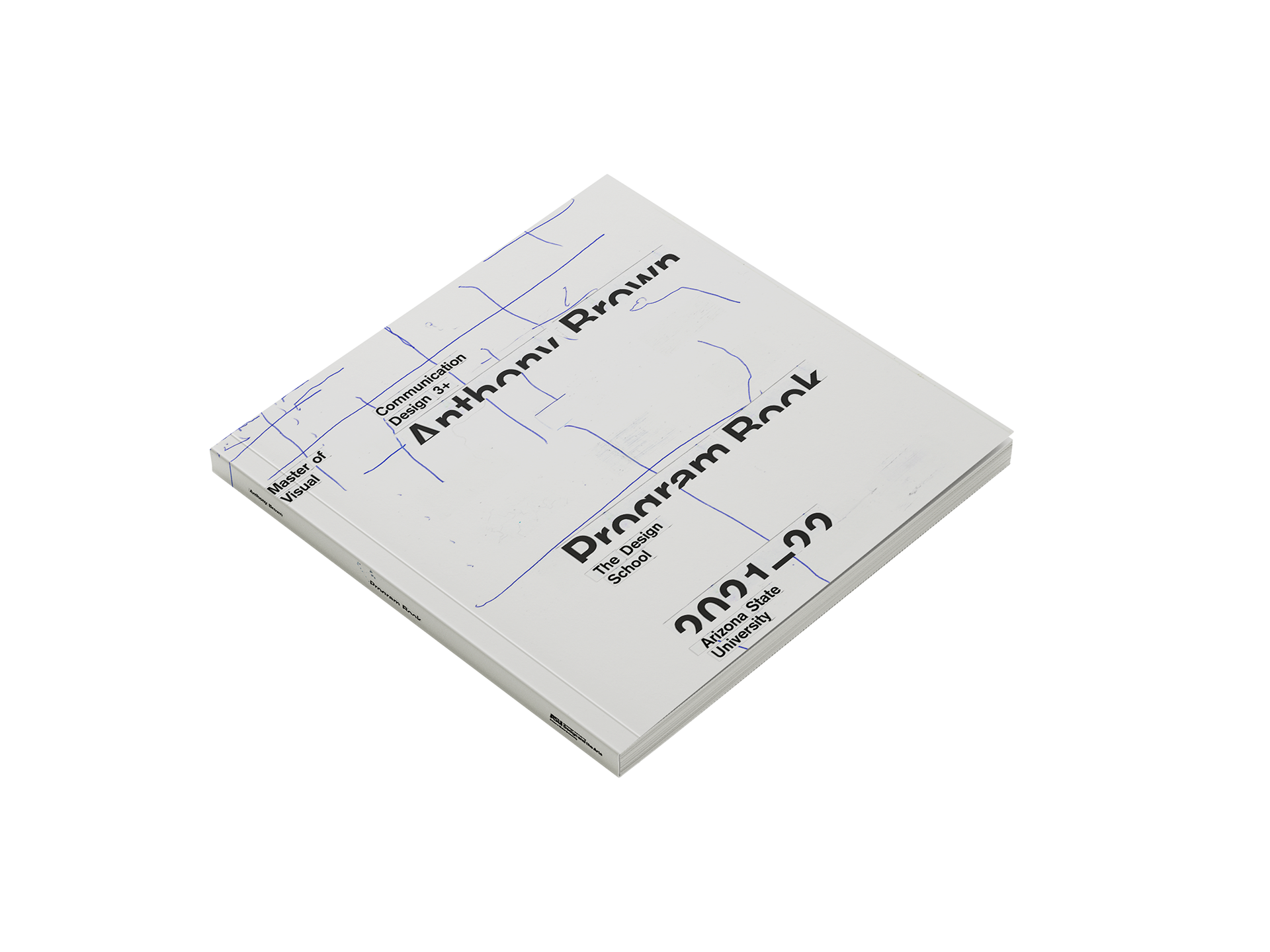 The cover features multiple corrections made in blue pen from a previous book cover assignment, where the typography was handset to explore relationships between text, define visual hierarchies, and examine spatial and typographic composition. The rest of the book follows this theme, printed in the indigo blue of the correction marks. The final book provides a clear and comprehensive overview of the 3+ experience, illustrating the progression from design fundamentals to graduate-level readiness in the Master of Visual Communication Design program.