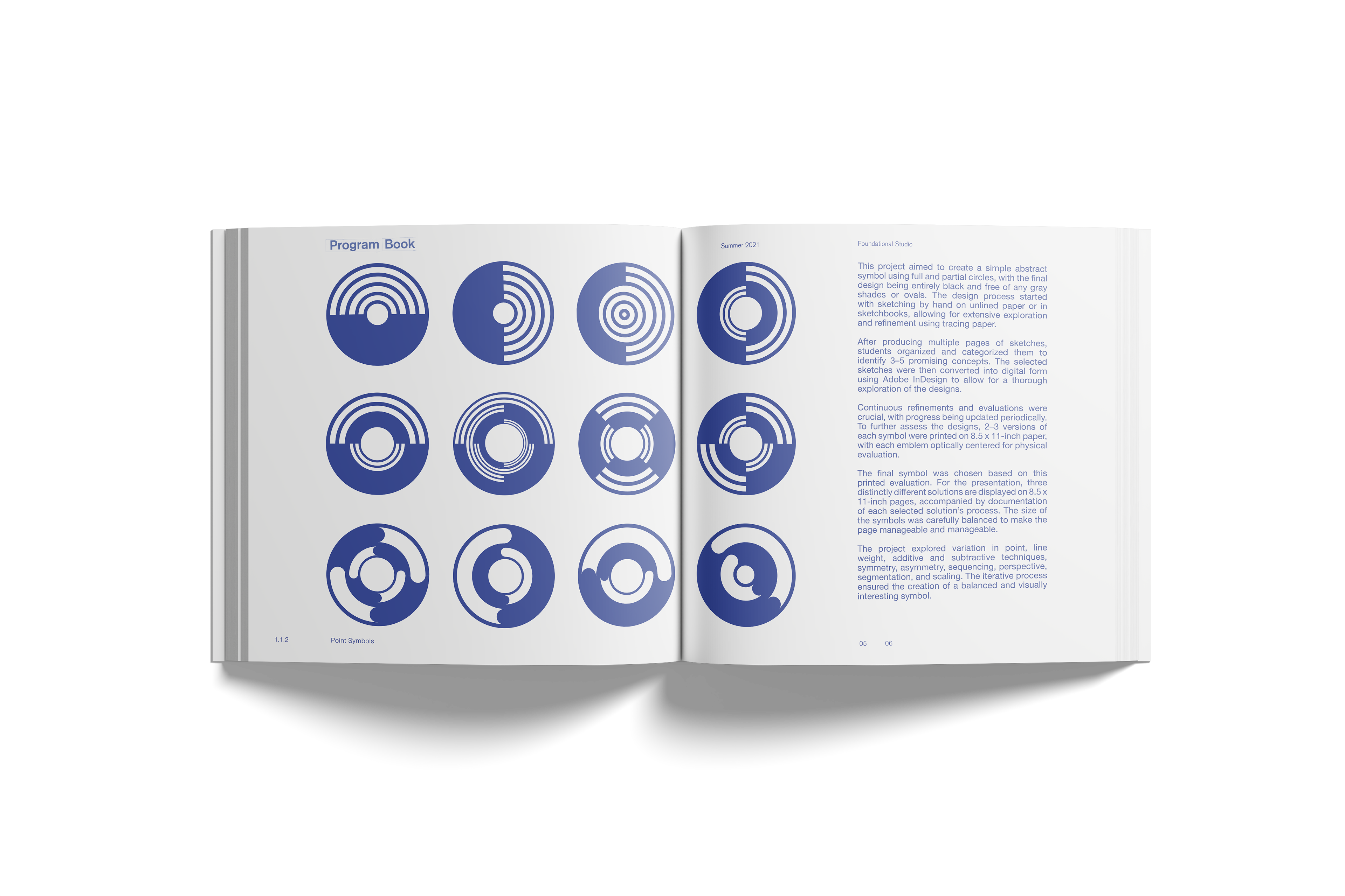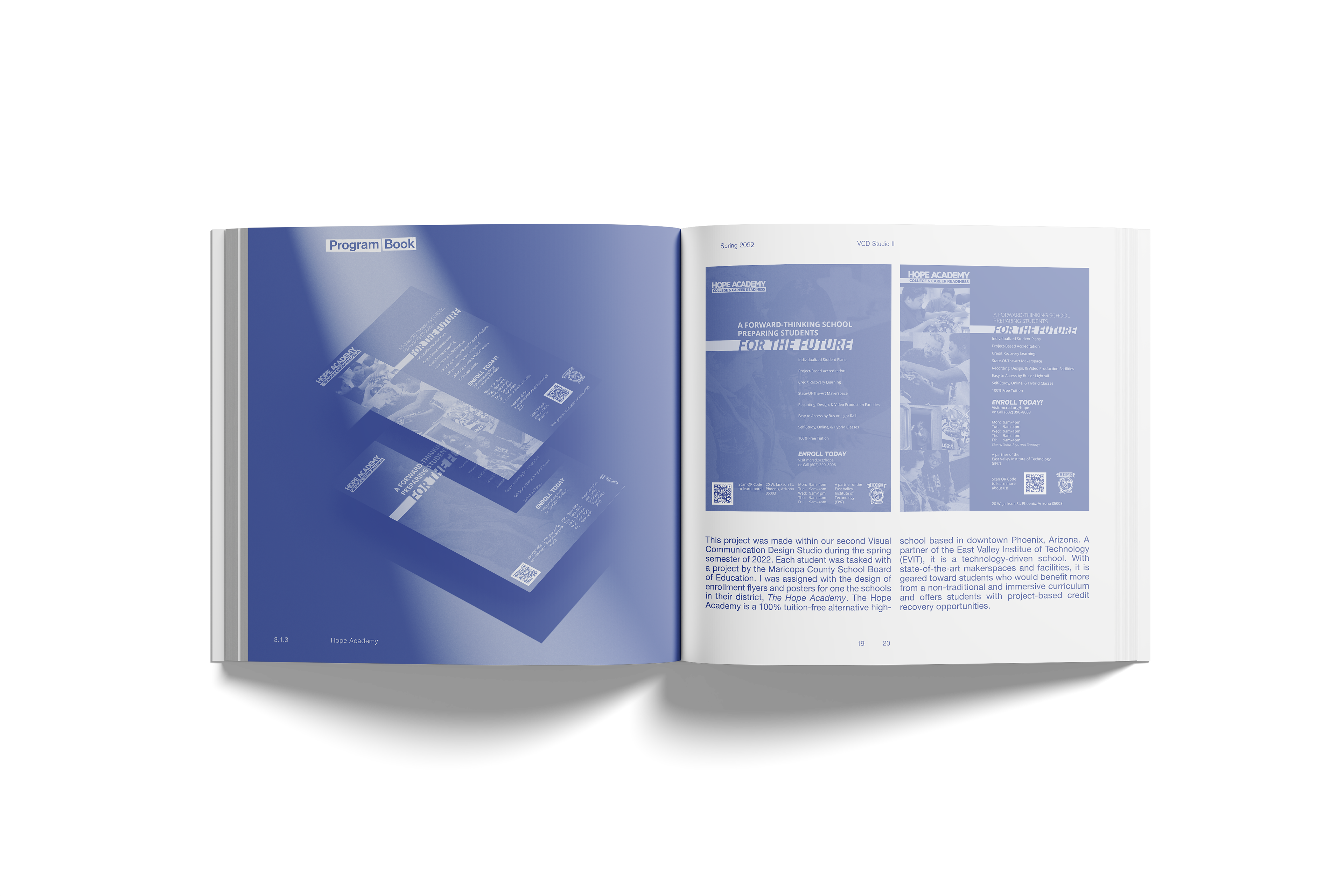 The MVCD 3+ Program Book (2022) was created to document and communicate the intensive, accelerated curriculum of the first year in the Visual Communication Design 3+ program at The Design School, Arizona State University. This program is designed for graduate students without a prior background in design. To achieve this, I collected, organized, and designed materials from the program’s assignments, processes, and foundational coursework, transforming them into a cohesive visual and informational format.